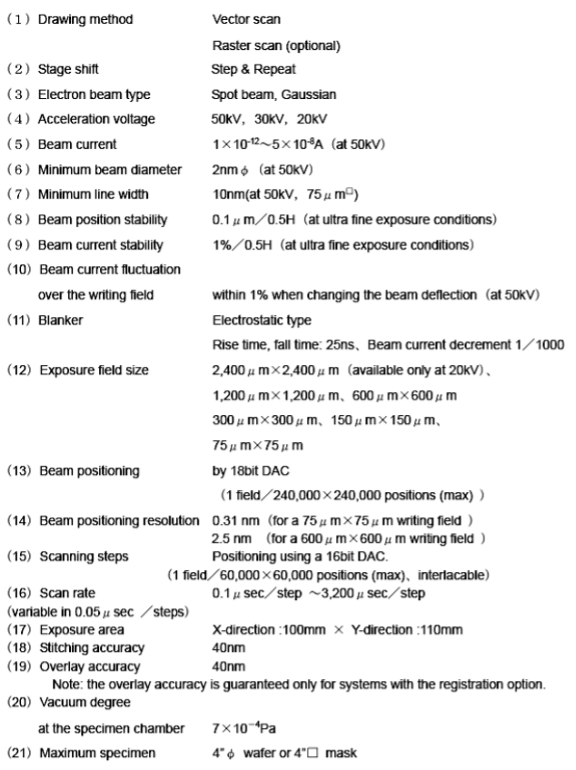 ◼️ 日本 ELIONIX 公司生產的 ELS-7500EX 電子束直寫系統,採用Gaussian beam 與單片式設計。利用電子束直寫把設計電路圖檔轉印出圖形在試片基板上。其電子束光斑可小至 3 nm,具備製作 線寬低於 50 nm 圖案的強大潛力。然而,由於單片式 Gaussian beam 設計在大面積製程上效率有限,因此主要應用於研究與開發用途。